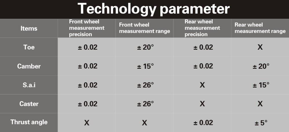 4.Measurement Angle:Toe,Camber,Caster,S.A.I,thrustangle,Setback angle,Max turning angle,Wheel tread,Wheel base,Wheel rolling redius.